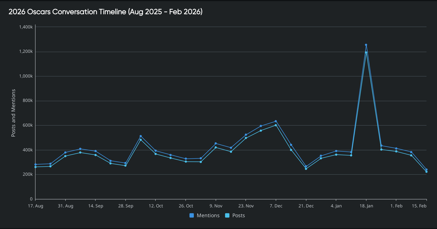 The largest spike in the dataset occurs in mid-January, immediately following the announcement of Academy Award nominations. That moment produces the highest single surge in posts and mentions across the measured period.