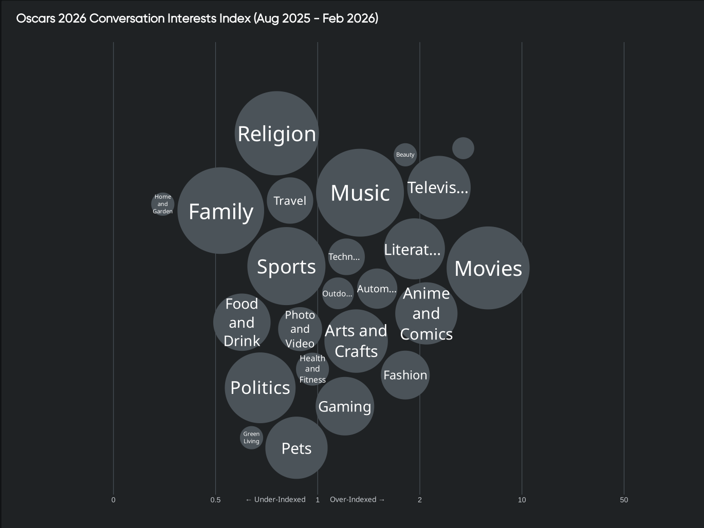 The interest index supports this overlap. Music over-indexes within the broader Oscars audience. Song categories are not peripheral; they generate standalone conversation.