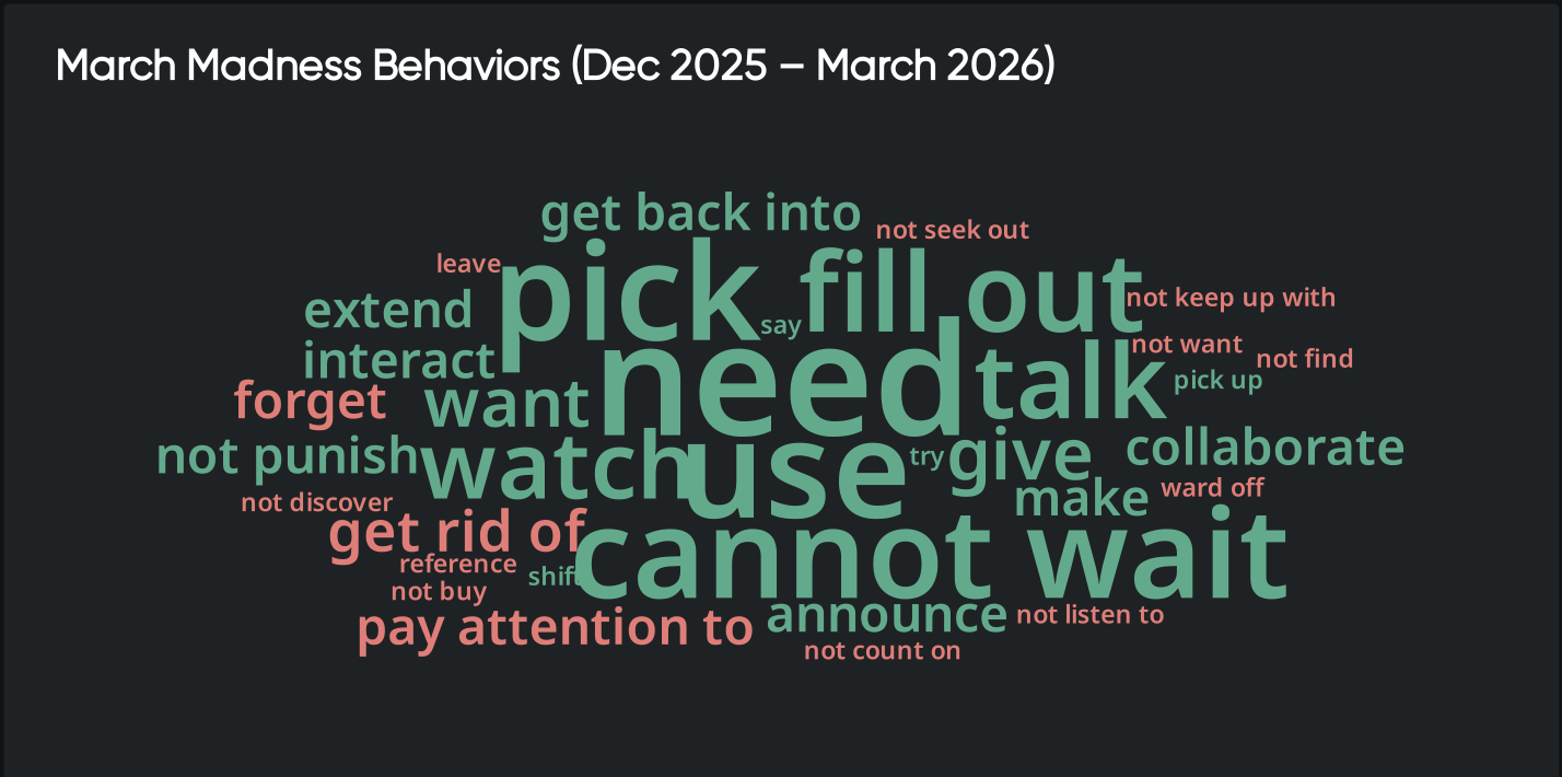 Roughly 97 percent of conversations remain neutral across every month, even as volume builds toward the tournament. That level of consistency shows that March Madness is not driven by emotional spikes. It is driven by repeated, normalized behavior. People do not show up once. They show up continuously, tracking teams, updating brackets, revisiting predictions, and reacting in cycles.