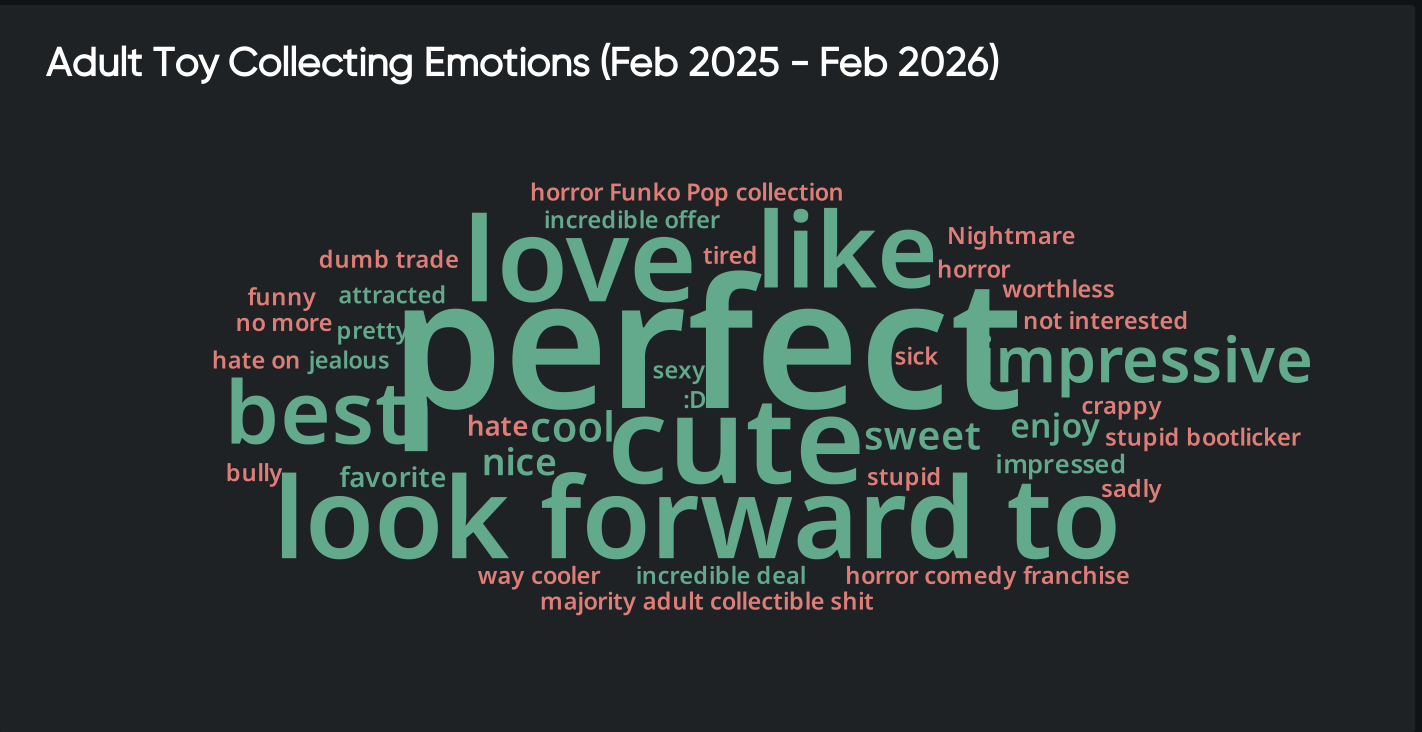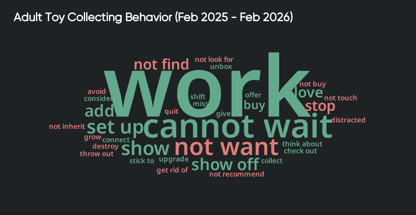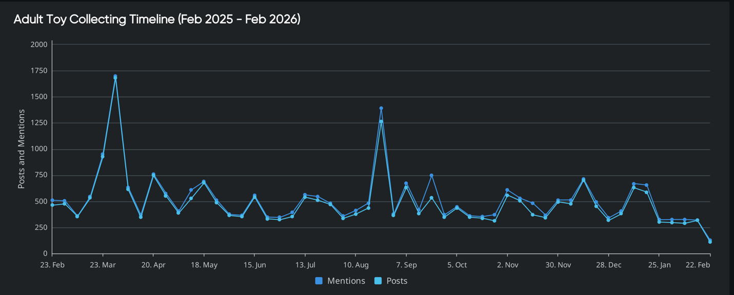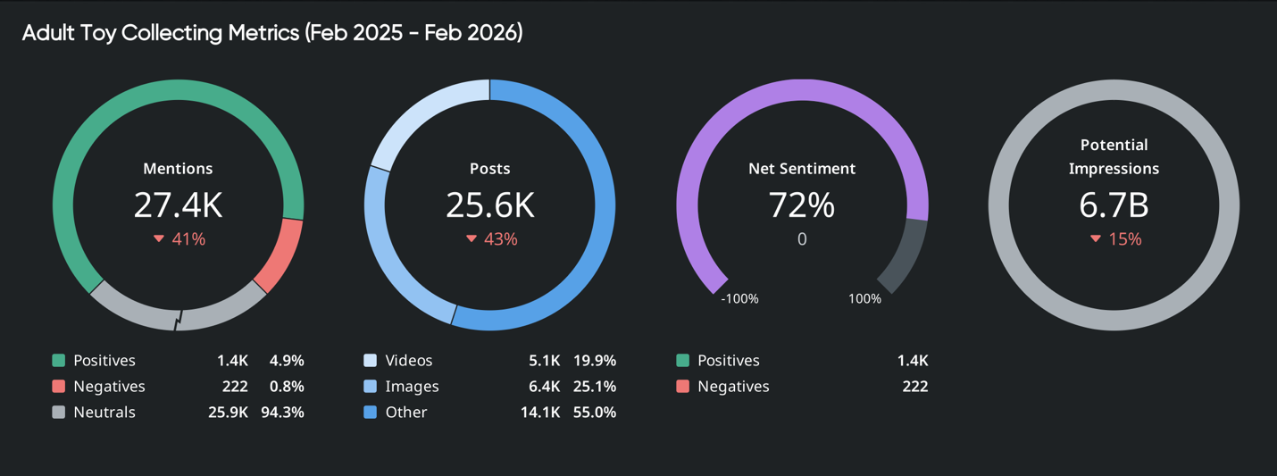 Between February 2025 and February 2026, adult toy collecting generated 27.4K mentions, 25.6K posts, 6.7B potential impressions, and a 72% net sentiment score:
