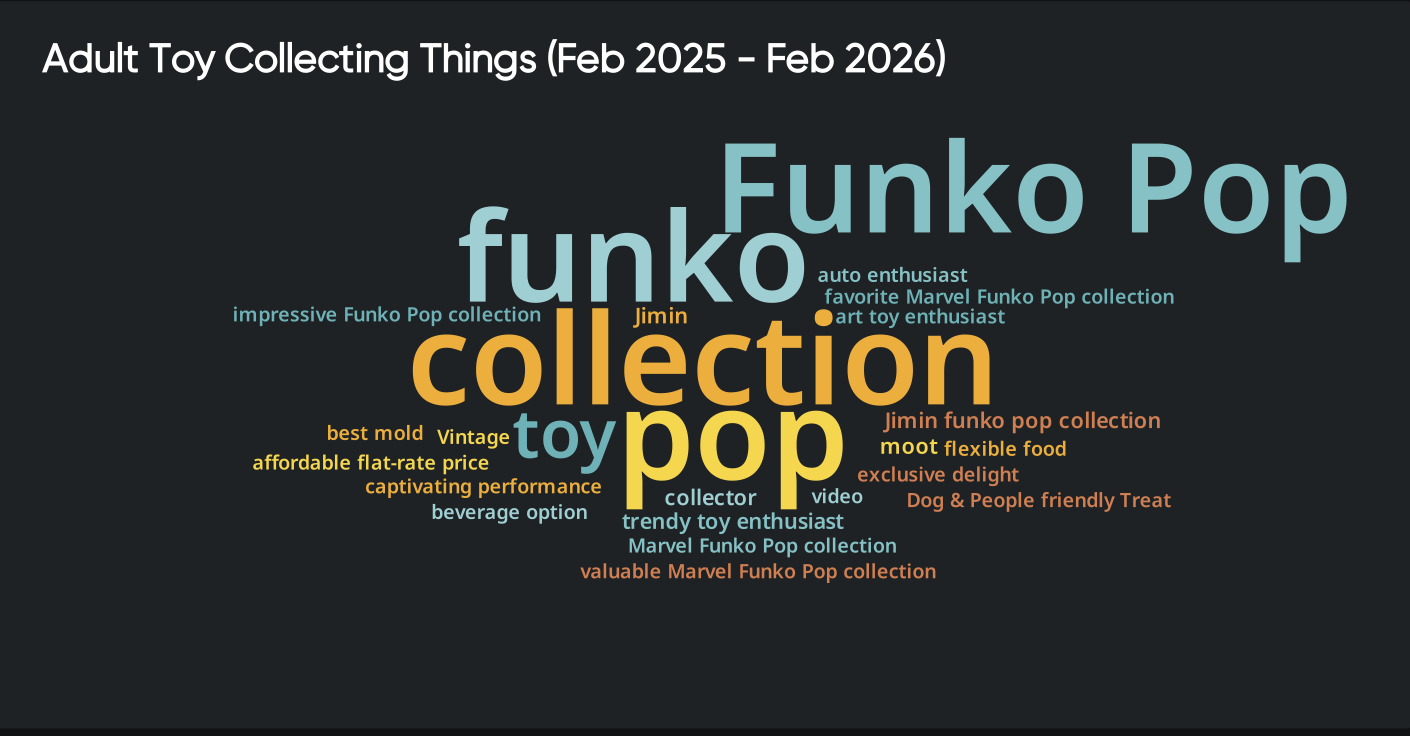 The “Things” analysis is dominated by language such as “Funko Pop,” “collection,” “collector,” “Marvel variants,” and “vintage.” These are not one-off purchases. They are curated inventories.